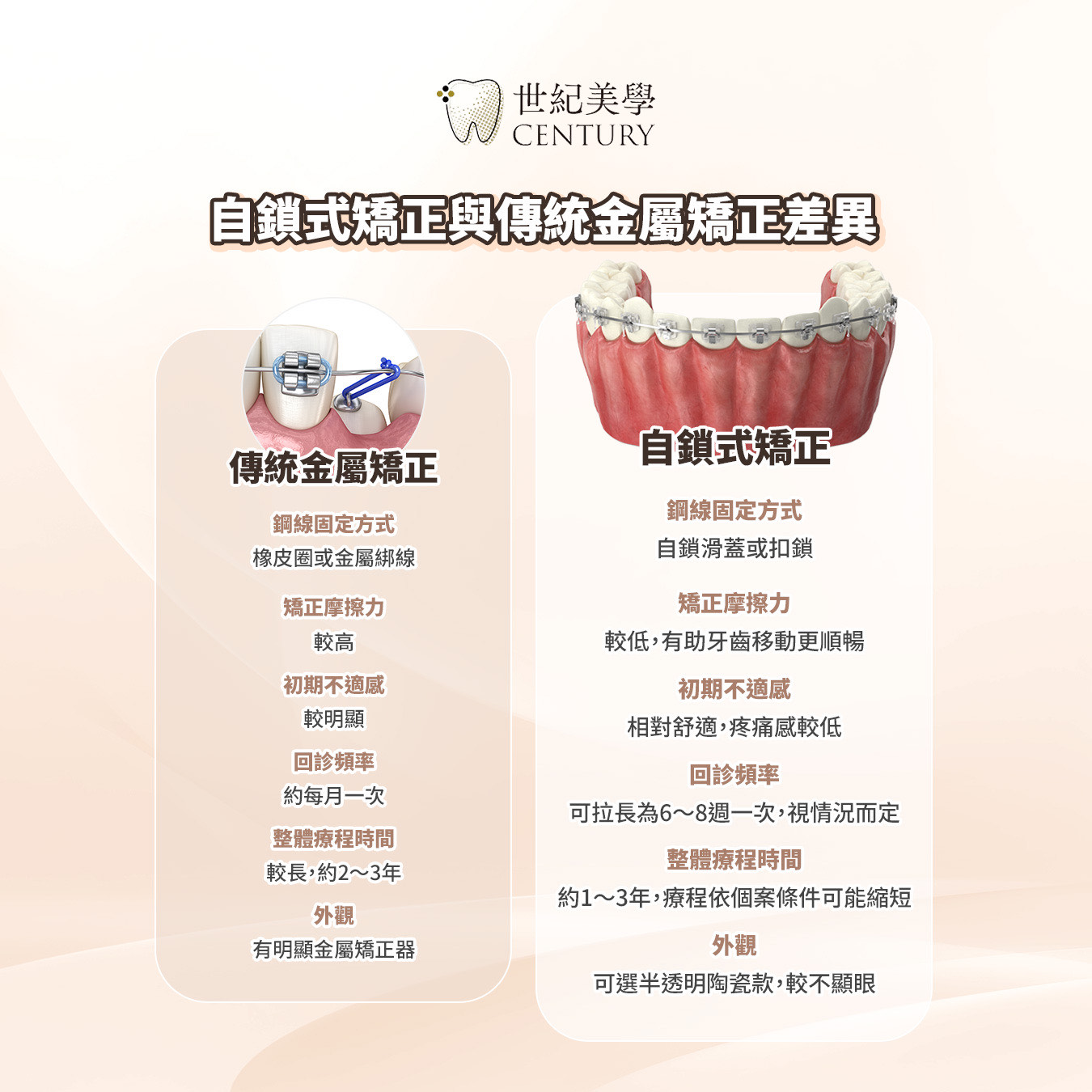 在台中評估自鎖式矯正時,建議選擇能提供透明流程與量身規劃的專科診所。台中世紀美學全專科診所,由齒顎矯正專科陳穎慧醫師親自規劃,提供安心且高效率的矯正體驗,協助患者能達成理想的治療成果。