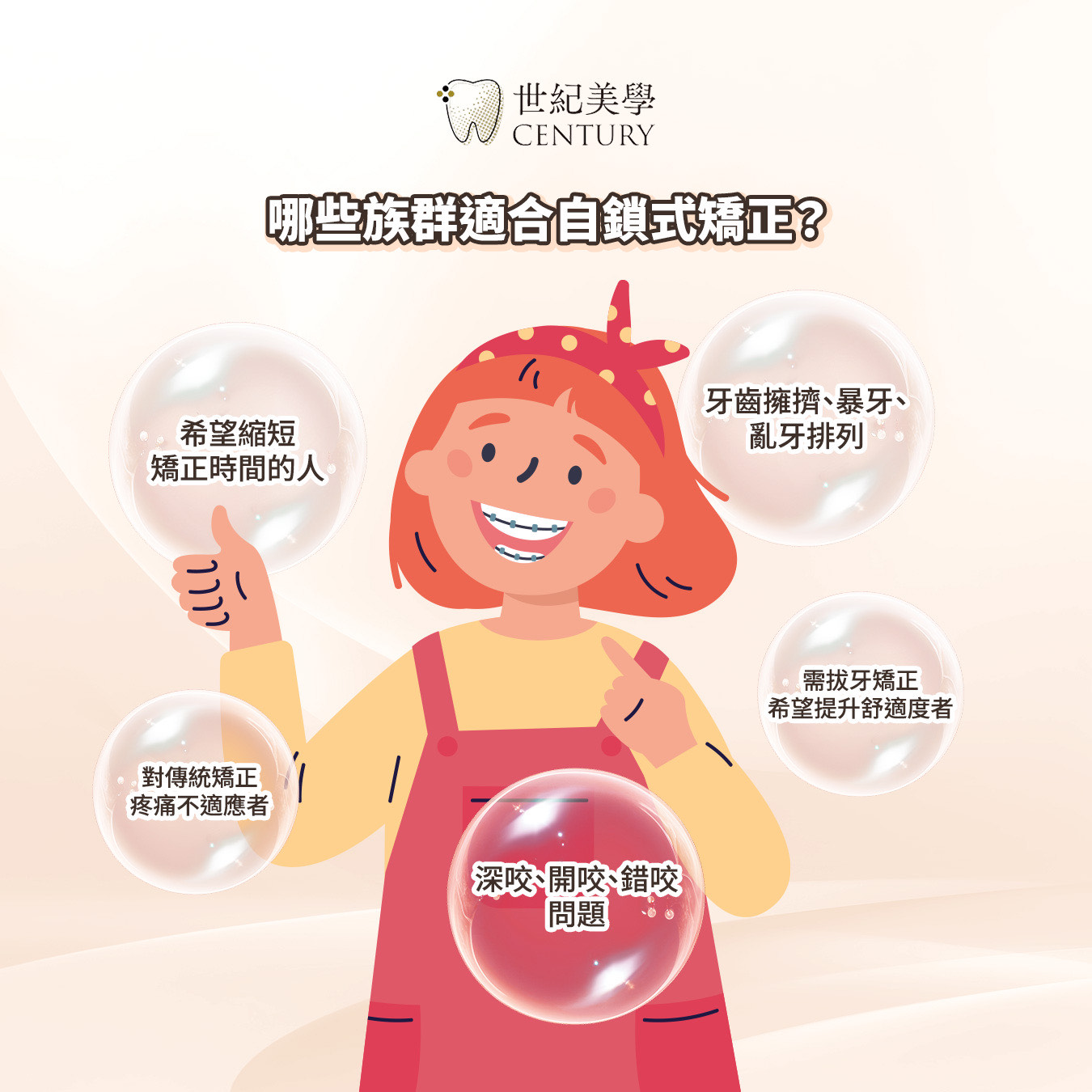 自鎖式矯正並非僅針對輕度不整,許多複雜案例也可考慮採用。以下族群情況較適合自鎖式矯正: